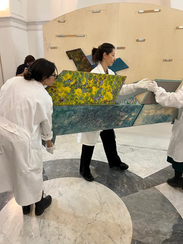 L’allestimento è stato infatti realizzato grazie a una collaborazione interdisciplinare tra la Sovrintendenza Capitolina e l’ICR che, assieme alla ditta Cantagalli - storica presenza accanto agli artisti romani per la costruzione di telai e cornici, tra i quali lo stesso Mambor - e alla preziosa testimonianza di Biagio Fersini, assistente di Mambor negli anni Novanta, ha portato alla soluzione espositiva che può essere ammirata al Casino Nobile di Villa Torlonia. È stato infatti necessario ricostruire esattamente il progetto di allestimento dei 7 elementi costituenti l’opera, a partire dallo schema compositivo lasciato dall’artista nel momento in cui è entrata nelle collezioni capitoline. L’opera rappresenta uno dei momenti cruciali del ritorno alla pittura di Renato Mambor, e un unicum per la sua peculiarità in cui i sette pezzi, diversi l’uno dall’altro per trattamento pittorico della superficie in legno e per le forme irregolari, invitano lo spettatore a ricostruirne la visione d’insieme.