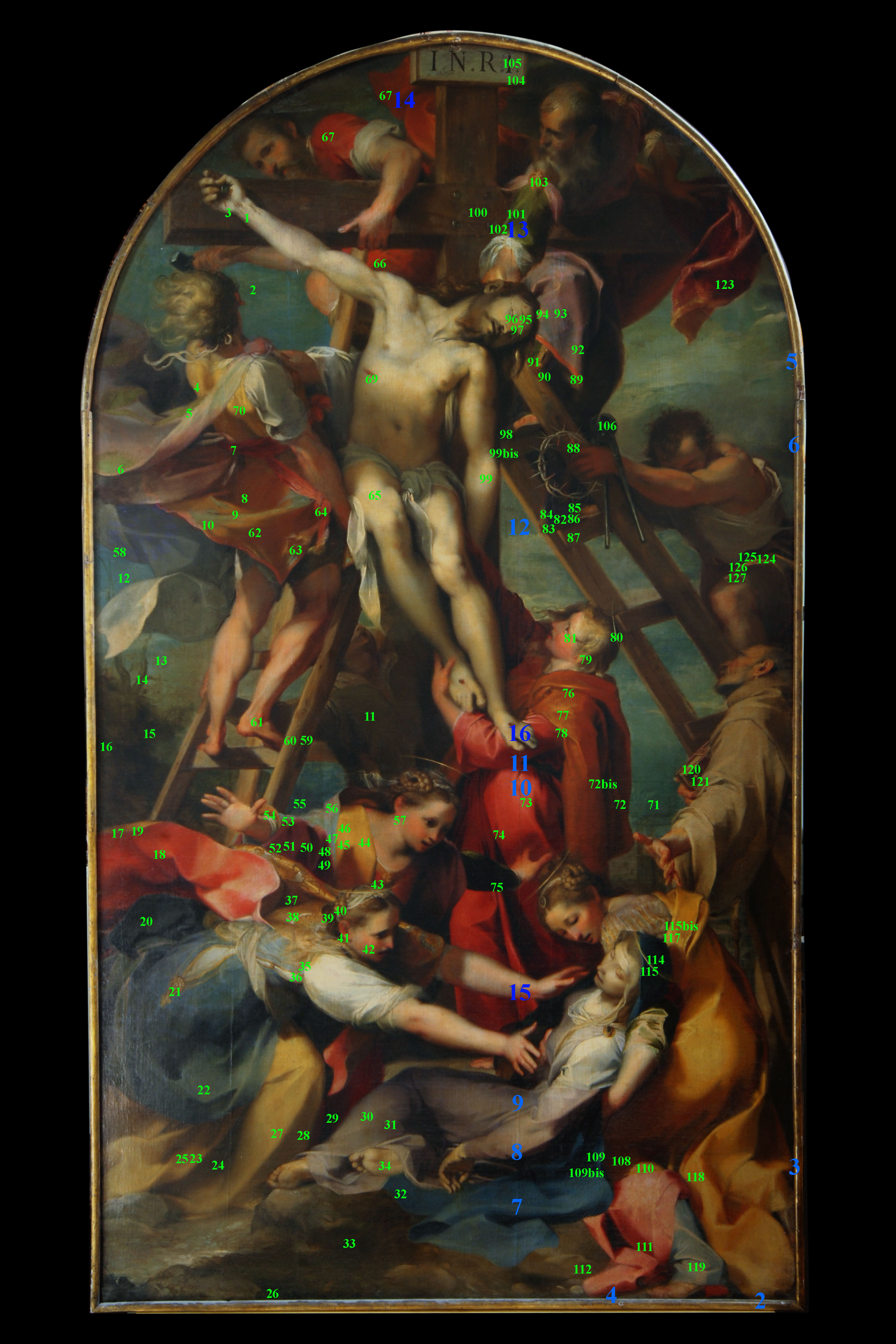 nella foto accanto al testo e nella photogallery: Federico Barocci, Deposizione dalla croce, 1569, Duomo di San Lorenzo, Perugia; generale, con indicati in verde i punti di analisi XRF e in blu i punti di prelievo
